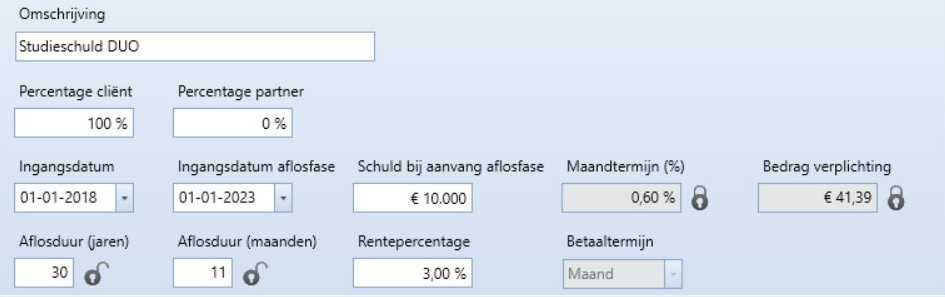 In het venster Schulden in het onderdeel Inventarisatie, is de schuld Studieschuld DUO, uitgebreid. De velden Aflosduur (jaren) en Aflosduur (maanden) zijn toegevoegd. Op basis van de Ingangsdatum en de Aflosduur wordt de Maandtermijn bepaald. In bepaalde situaties is het wenselijk om deze te kunnen wijzigen. Je kunt dan het slotje openen en de duur wijzigen. De Maandtermijn (%) wordt dan ook automatisch aangepast aan de gewijzigde duur.