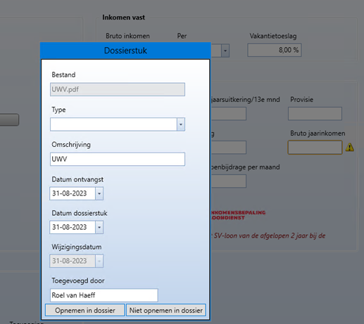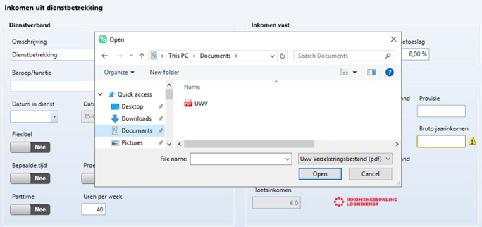 Selecteer het UWV-verzekeringsbericht dat je van je relatie hebt ontvangen en klik op Open. Het UWV-verzekeringsbericht wordt nu verwerkt in de rekentool Inkomensbepaling Loondienst. Je kunt het UWV-verzekeringsbericht direct toevoegen aan het Dossier door op Opnemen in dossier te klikken.