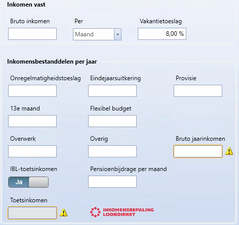 - Wanneer u de knop Flexibel op Ja zet, kunt u in het blok Inkomen het flexibele inkomen per jaar invoeren.